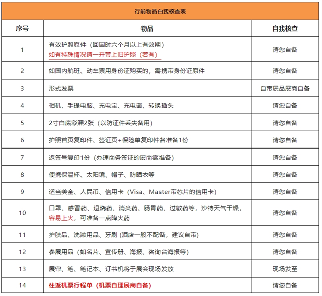 另外請留意:請自查護(hù)照上是否有以色列簽證頁或者進(jìn)出境記錄,如果有最好去換一本護(hù)照,以便更順利入境中東國家。(去年我司組團(tuán)入境沙特,有以色列簽證記錄的人員也順利入境沙特,但考慮到最近巴以局勢緊張,建議展商提前換發(fā)護(hù)照)簽證辦理后更換護(hù)照人員務(wù)必新舊護(hù)照一并攜帶,機(jī)票購買后更換護(hù)照的請務(wù)必聯(lián)系出票處更新護(hù)照信息!