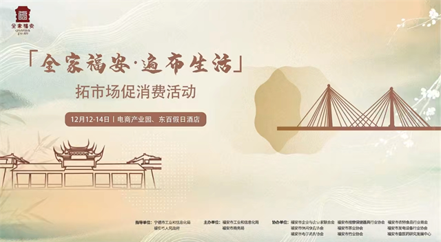 “全家福安,遍布生活”拓市場促消費(fèi)活動(dòng)將在福安市電商產(chǎn)業(yè)園設(shè)置“全家福安”主題展示館,集中展示福安市按摩器具、小件竹制品、飲食食品、畬族畬藥、家用電器、傳統(tǒng)工藝美術(shù)品等特色產(chǎn)品,現(xiàn)場預(yù)計(jì)將有超過