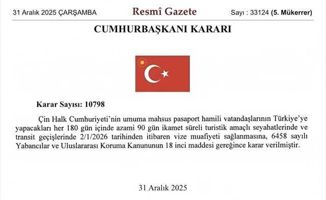 據央視新聞,當地時間12月31日,土耳其《官方公報》發布總統令,宣布自2026年1月2日起,對持中國普通護照的公民實行免簽入境政策。根據規定,在每180天內,免簽停留時間累計不超過90天,適用于旅游和過境目的。該決定依據土耳其《外國人和國際保護法》第18條作出。